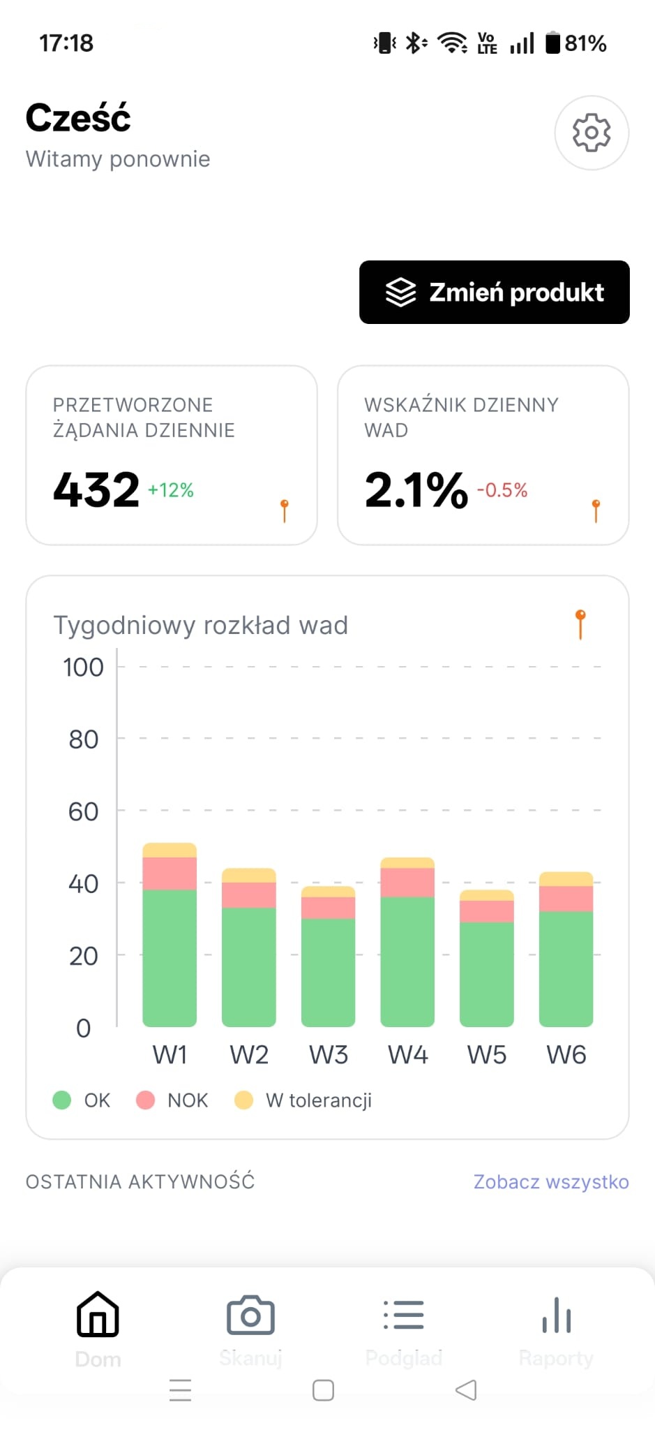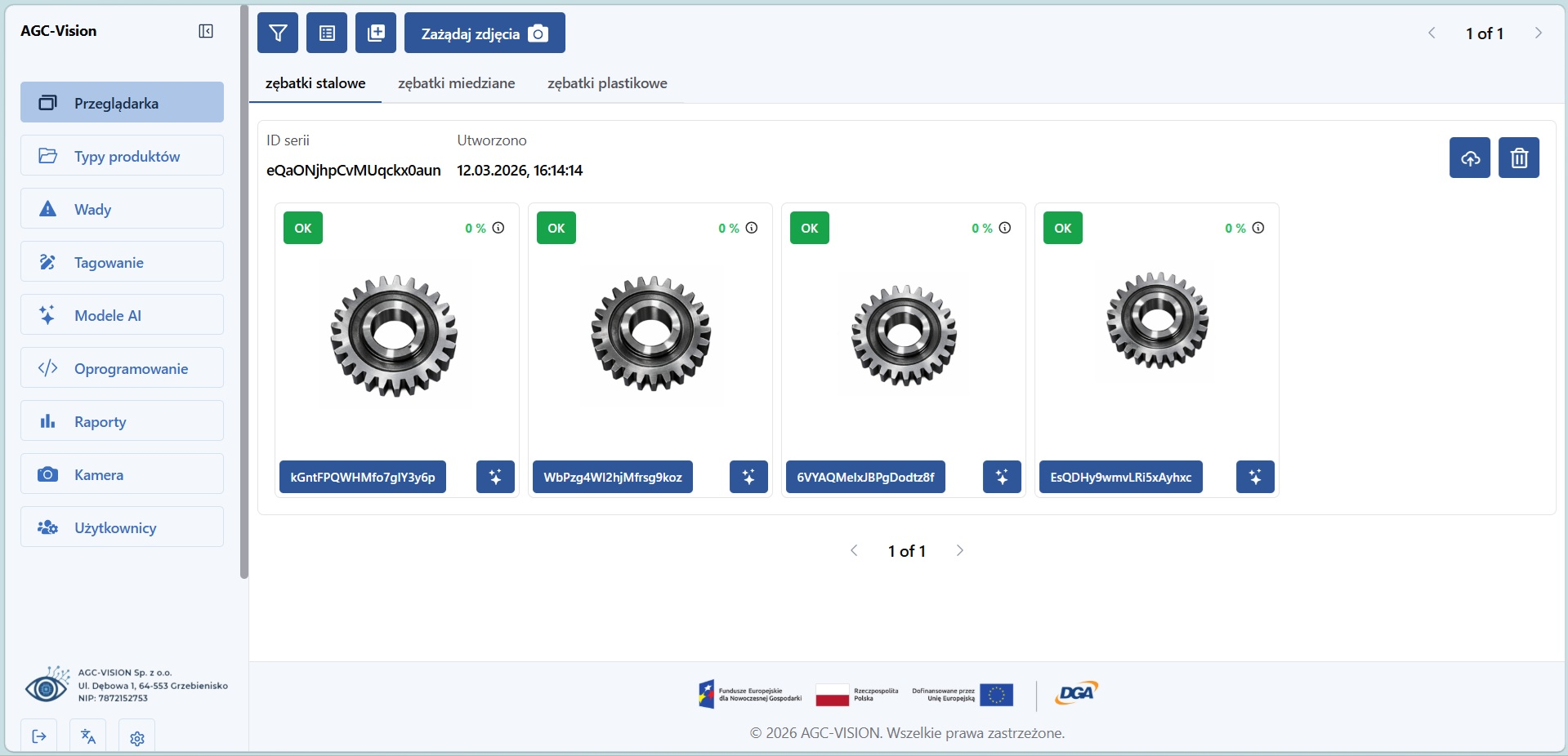 Po pozytywnej walidacji system zaczyna analizować zdjęcia w czasie rzeczywistym. Wyniki są prezentowane w panelu analitycznym, a użytkownicy mogą natychmiast oceniać elementy jako OK/NOK.