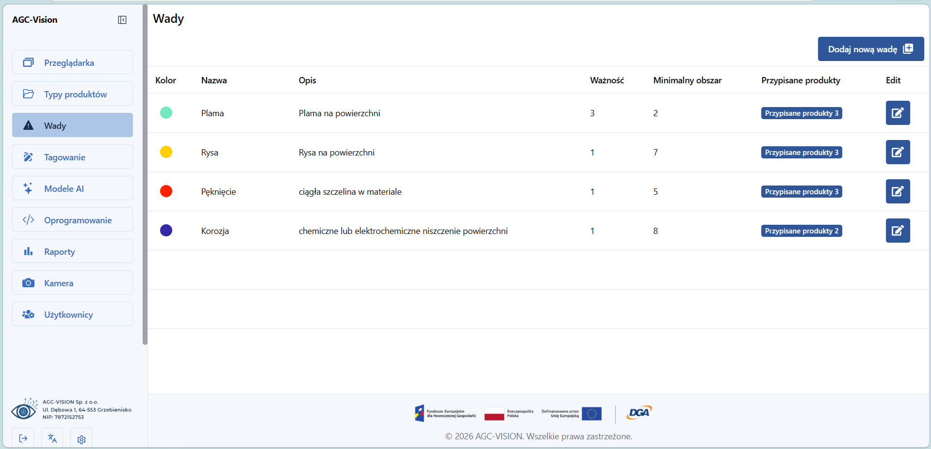 Definiowanie nowych rodzajów defektów oraz wygodny podgląd już istniejących. Użytkownik może dodawać opisy, nadawać kolory i łączyć wady z typami produktów.