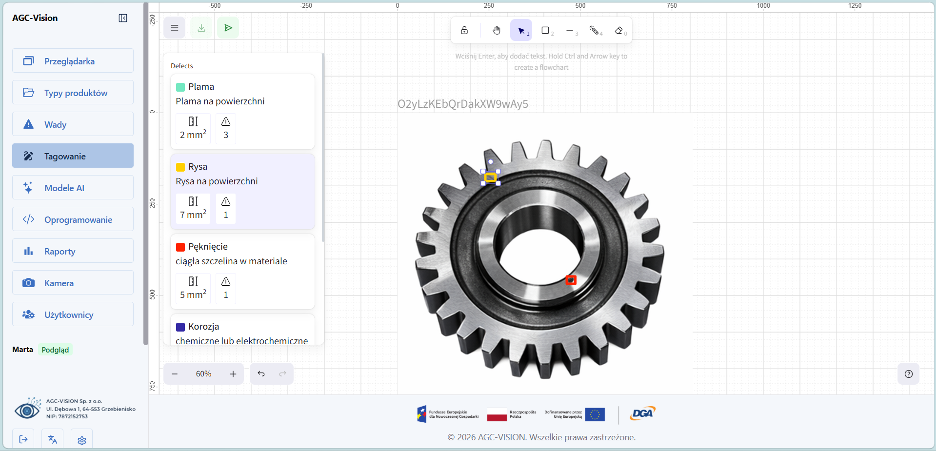 Zebrane zdjęcia są oznaczane — wskazywane są konkretne defekty, ich lokalizacja oraz typ. Na tej podstawie powstaje zestaw danych treningowych, który stanowi fundament do nauki modeli AI.