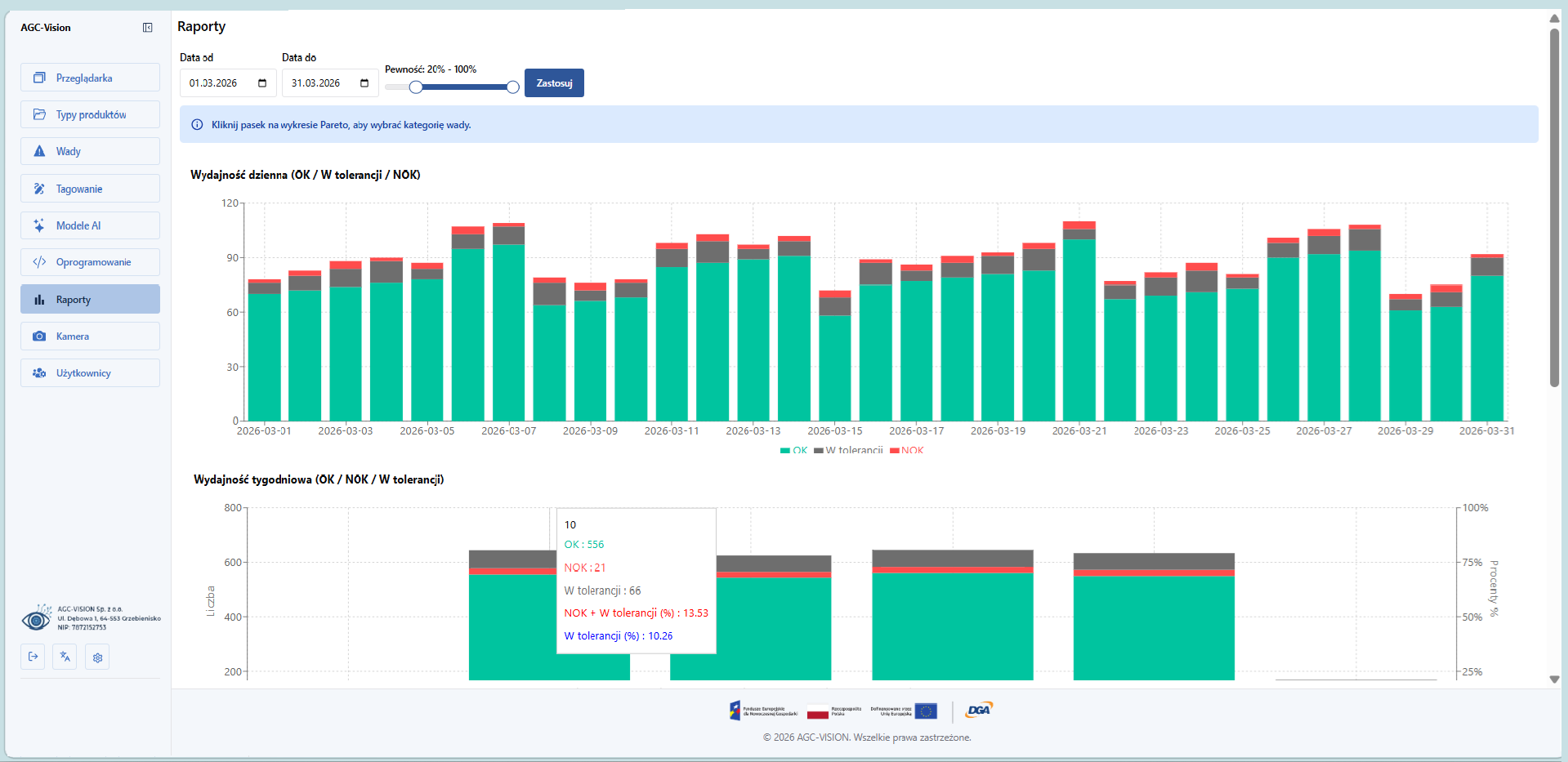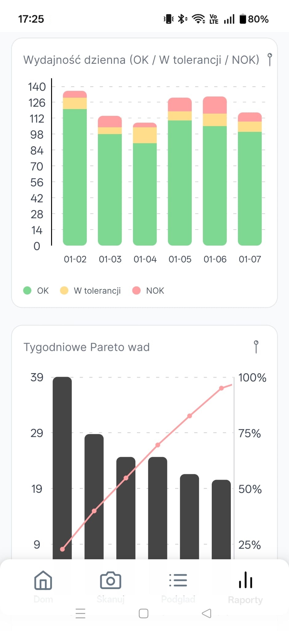 Przejrzysty dostęp do statystyk z linii produkcyjnej: liczba wykrytych błędów, trendy jakości oraz szczegółowe zestawienia dla poszczególnych stanowisk. Dzięki temu łatwo monitorować jakość procesu i szybko reagować na odchylenia.
