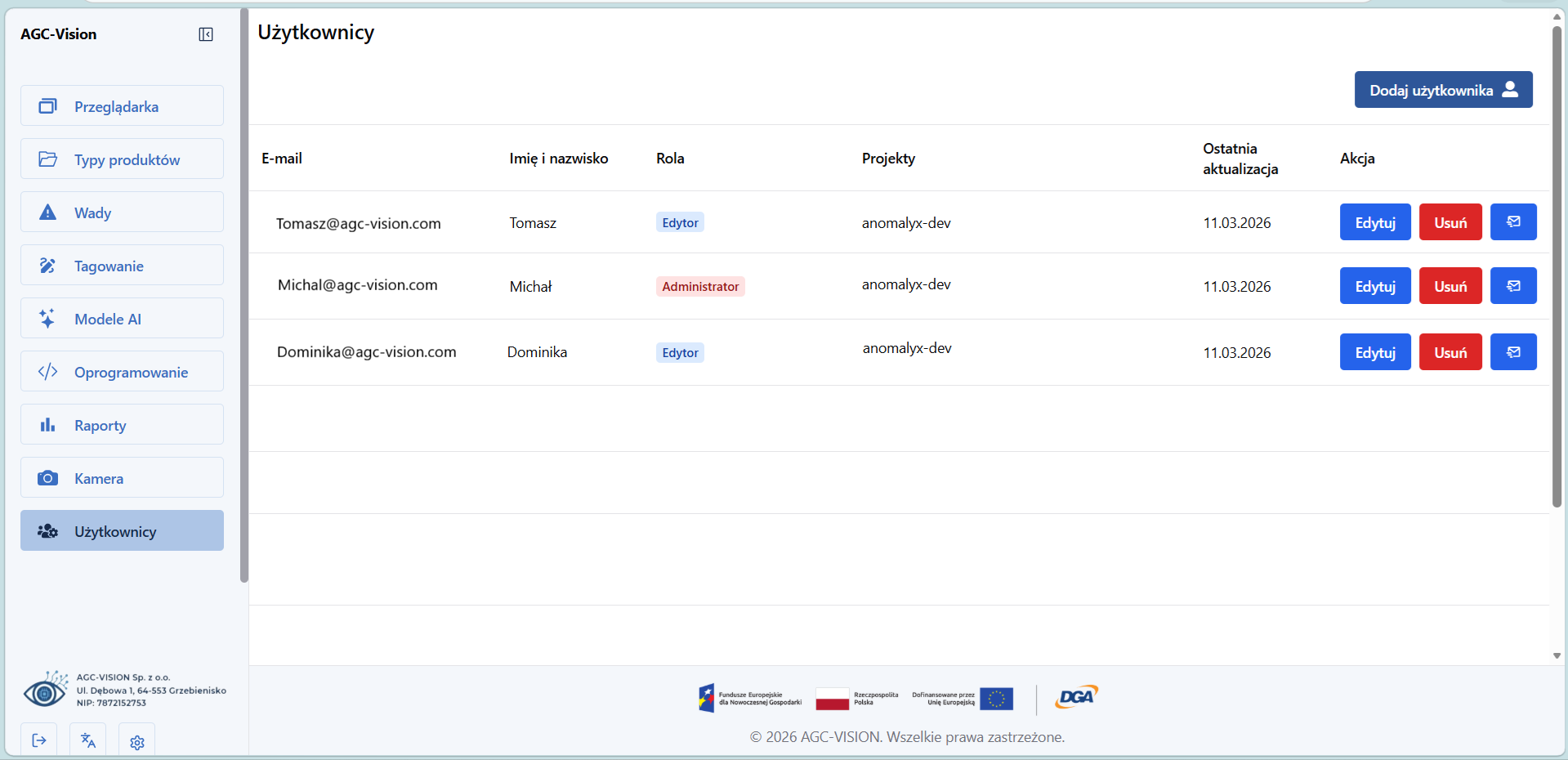Zarządzanie dostępami w systemie: tworzenie kont, nadawanie ról i uprawnień oraz kontrola, kto może przeglądać zdjęcia, edytować dane czy zarządzać modelami. Dzięki temu każdy użytkownik ma dostęp dokładnie do tych funkcji, których potrzebuje w swojej pracy.